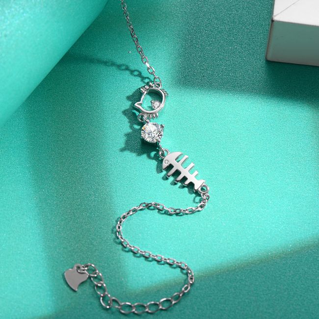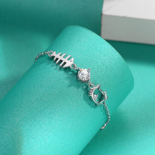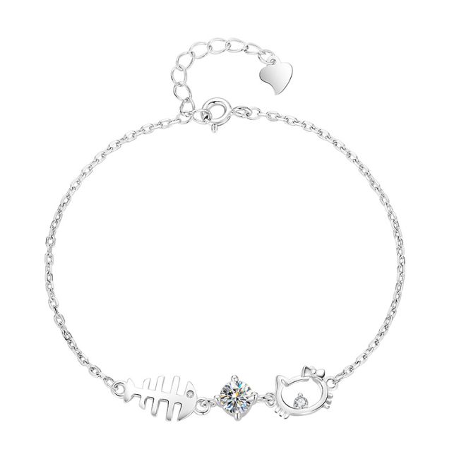 Bracelet 925 Sterling Silver Cat and Fish Charm with Moissanite Stone Adjustable Chain