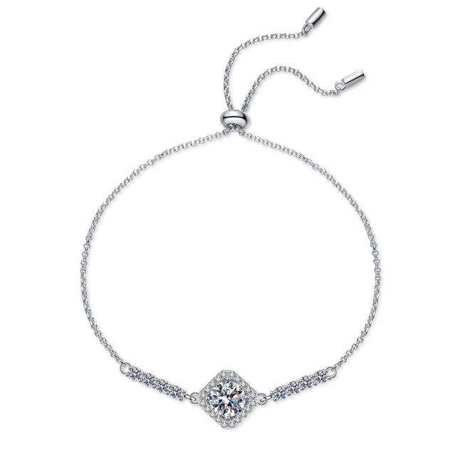 Bracelet Adjustable Sterling Silver Chain with Cushion Cut Moissanite Stone Square Halo Design