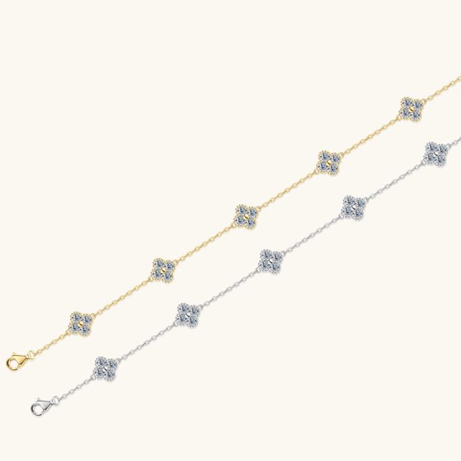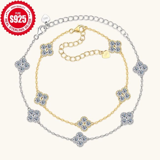 - Design: Elegant four-leaf clover motif with sparkling moissanite center stones surrounded by pave-set accents