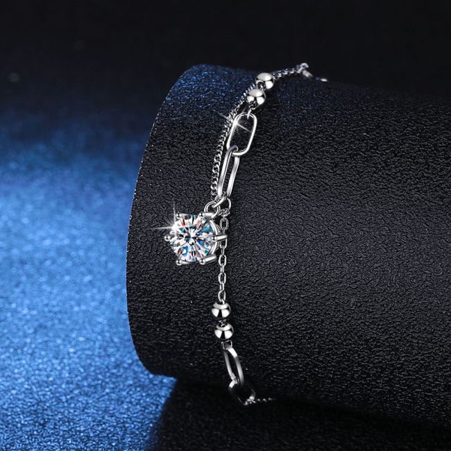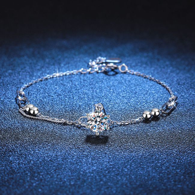 Bracelet Sterling Silver Chain with Brilliant Round Cut Moissanite Center Stone and Beaded Accents