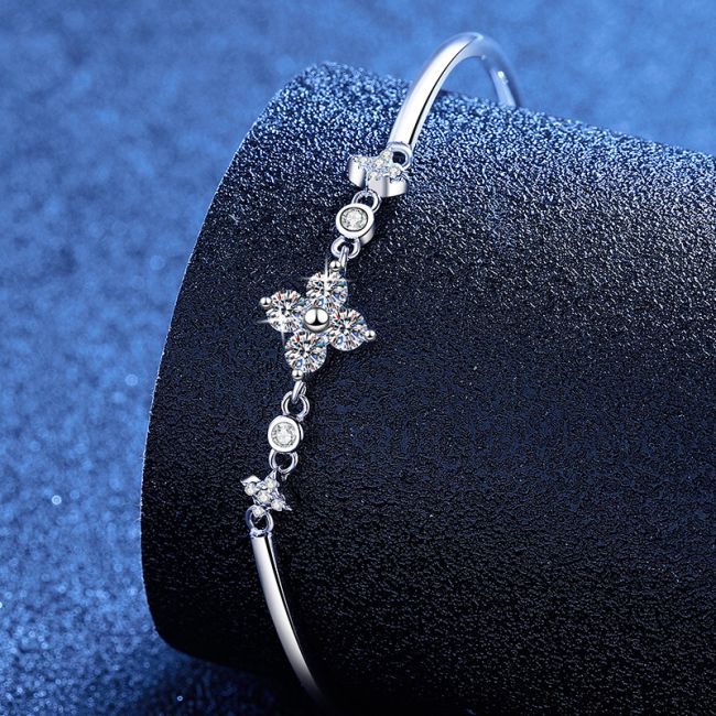 Bracelet Sterling Silver Four Leaf Clover Adjustable Bangle with Moissanite and Star Accents