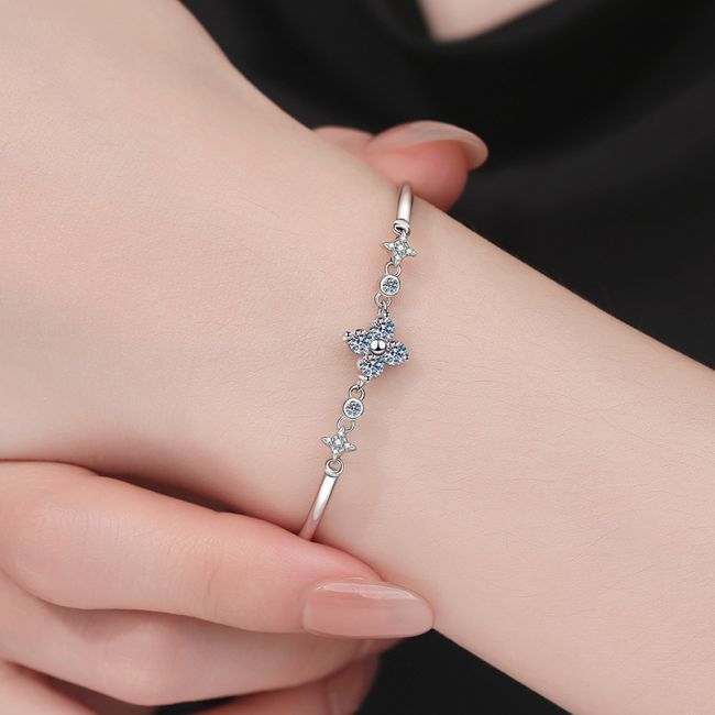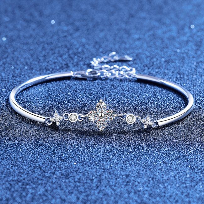 Bracelet Sterling Silver Four Leaf Clover Adjustable Bangle with Moissanite and Star Accents