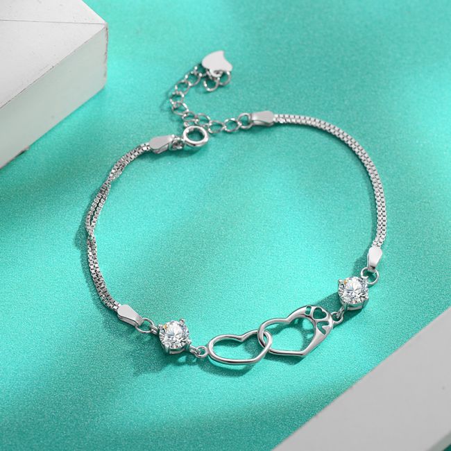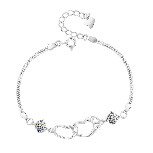 Bracelet Sterling Silver Heart Chain with Moissanite Stones Minimalist Fashion Jewelry