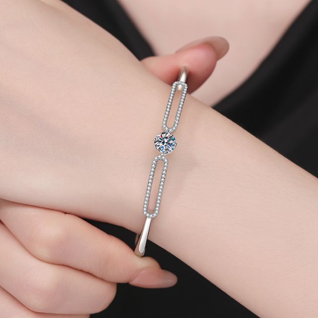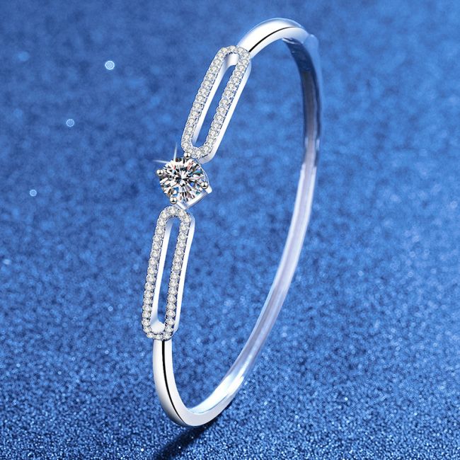 Bracelet Sterling Silver Moissanite Bangle with Elongated Oval Design and Center Stone