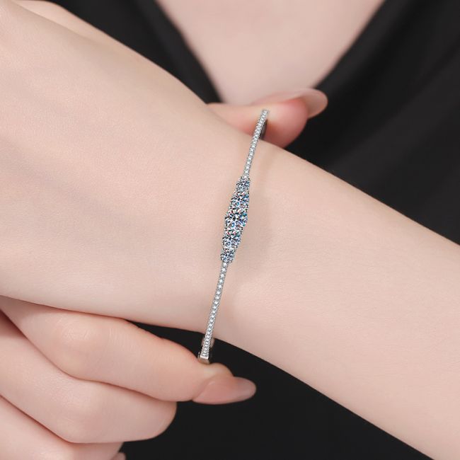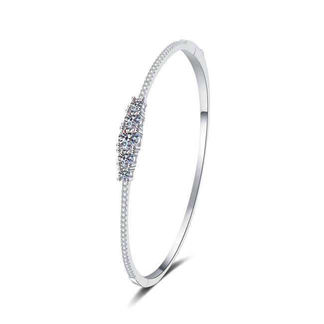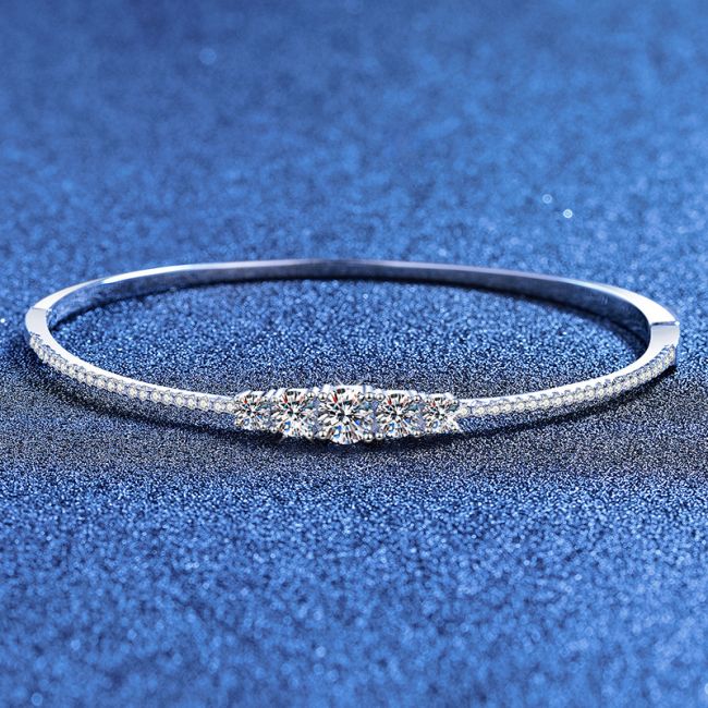 - Design: Sleek bangle style with five graduated round brilliant-cut moissanite stones as centerpiece