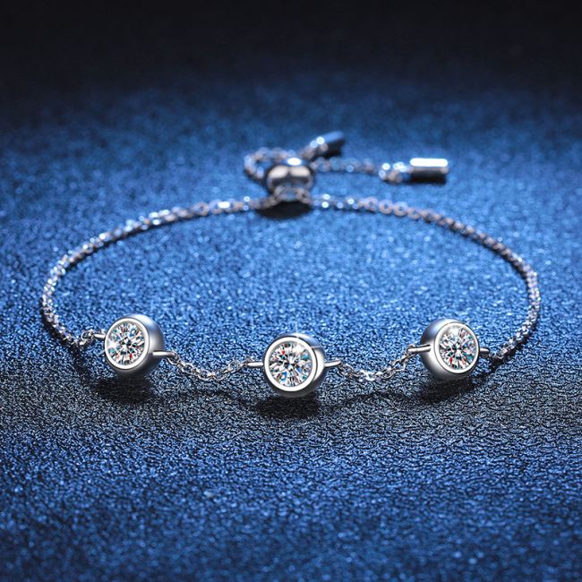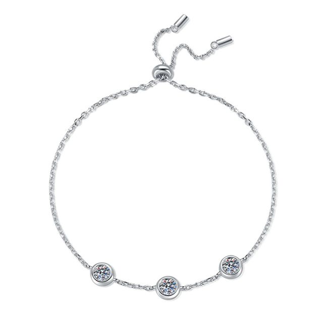 Bracelet Sterling Silver Moissanite Chain with Three Round Bezel Set Stones Adjustable Slider Clasp