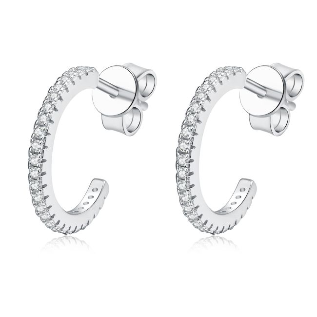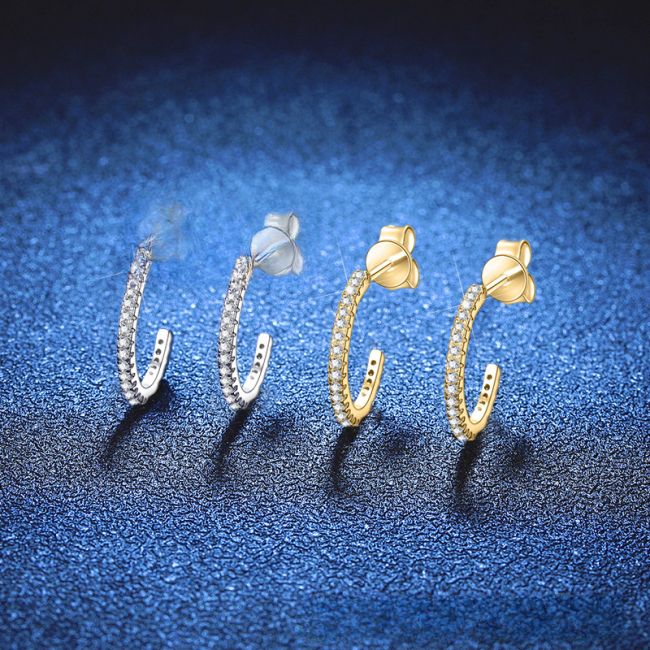 - Design: C-shaped hoop earrings with continuous moissanite stone setting along the front curve