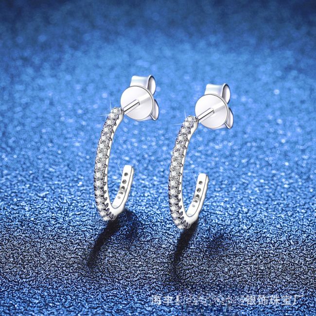 Earrings - 925 Sterling Silver C-Shape Hoop Earrings with Moissanite Stones Minimalist Elegant Design