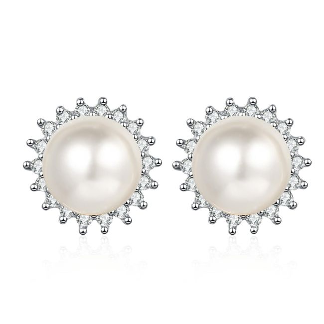 Earrings Featuring Sunflower Design with Moissanite and Pearl Accents in Sterling Silver
