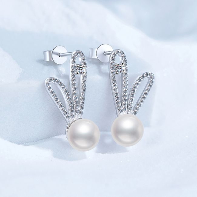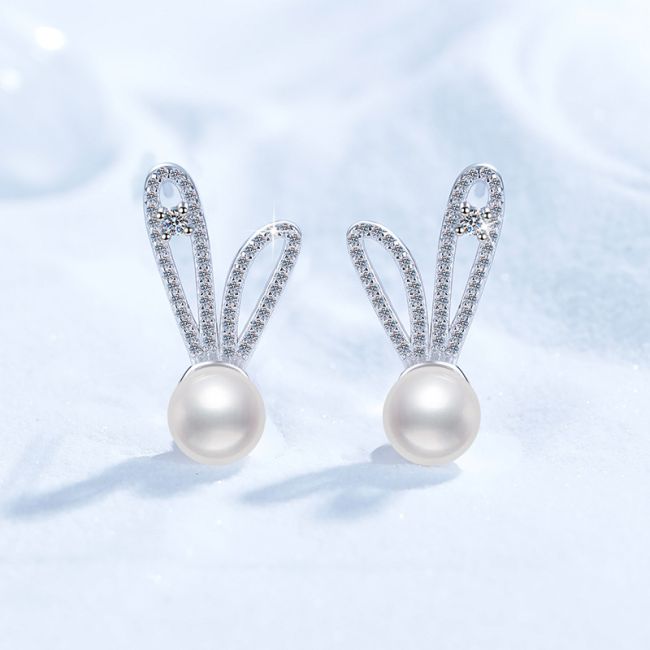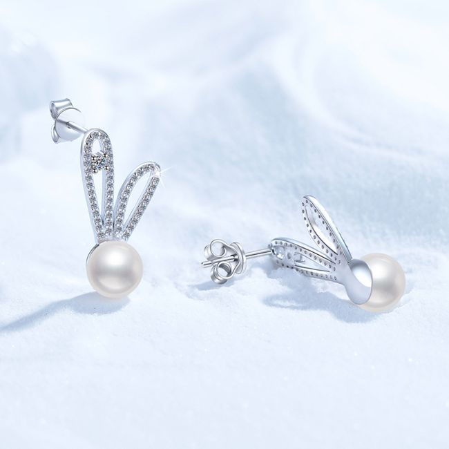 Earrings Sterling Silver Bunny Rabbit Ear Studs with Freshwater Pearl and Moissanite Accents