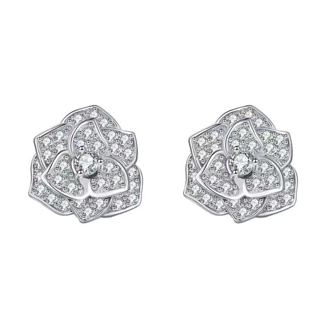Earrings - Sterling Silver Camellia Flower Stud Earrings with Moissanite Stones