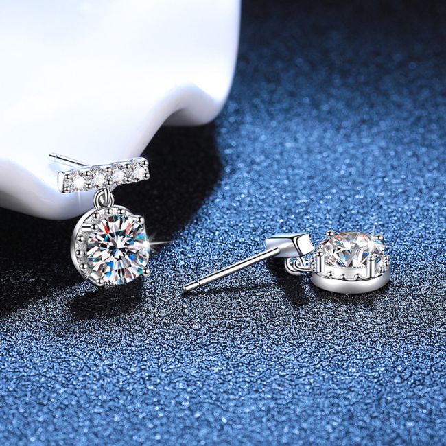 - Design Style: Elegant drop design with horizontal bar top embellished with smaller stones and round brilliant-cut moissanite pendant