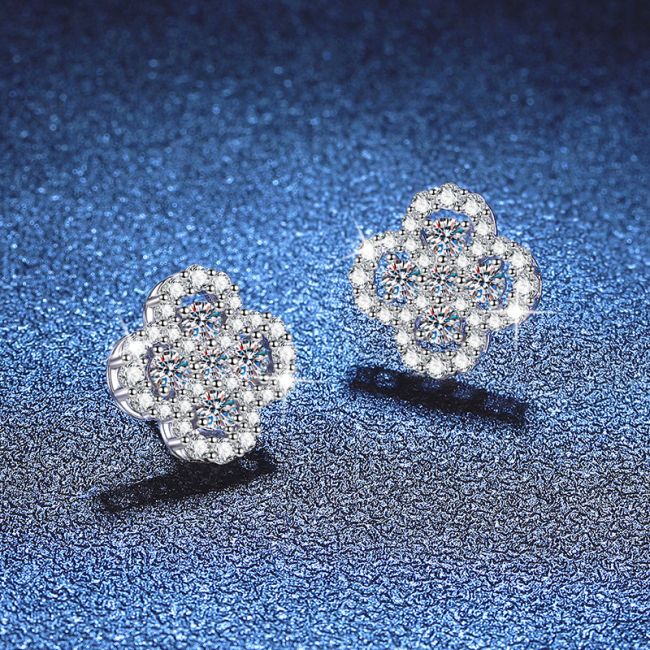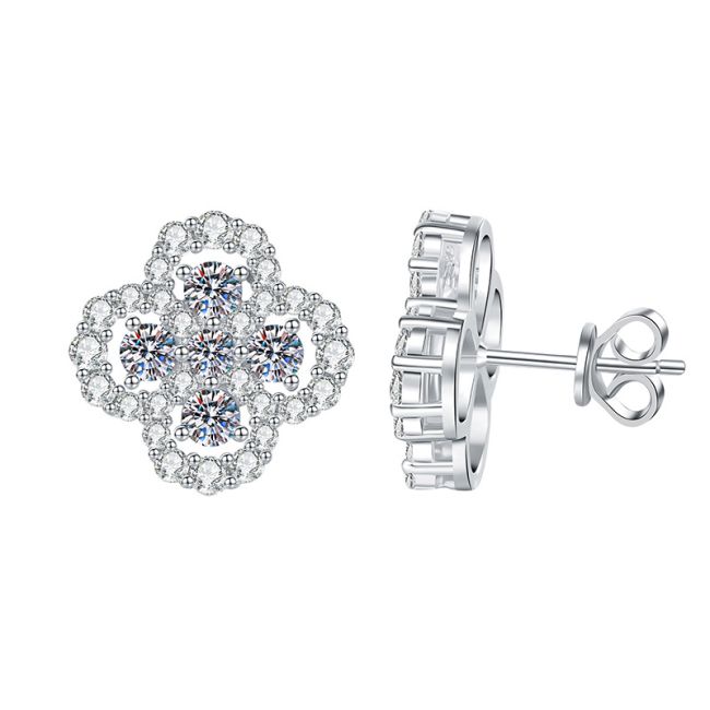 Earrings - Sterling Silver Four Leaf Clover Stud Earrings with Full Pave Moissanite Stones