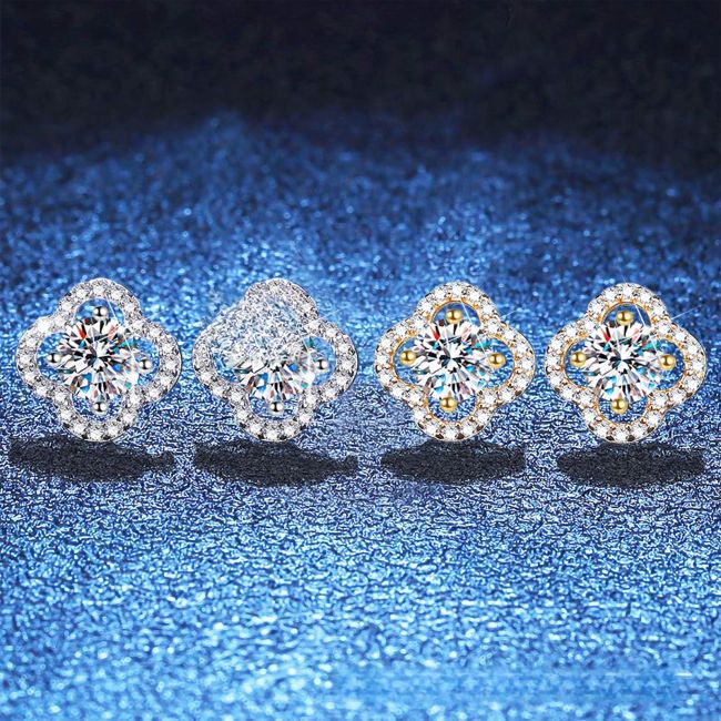 Earrings Sterling Silver Four Leaf Clover Stud Earrings with Moissanite Diamond Center Stone