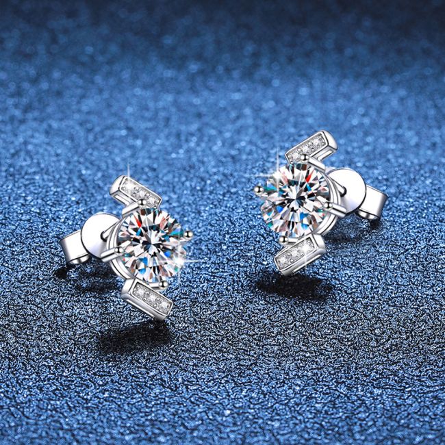 Earrings Sterling Silver Geometric Four Prong Moissanite Stud Earrings with Round Brilliant Cut Stones