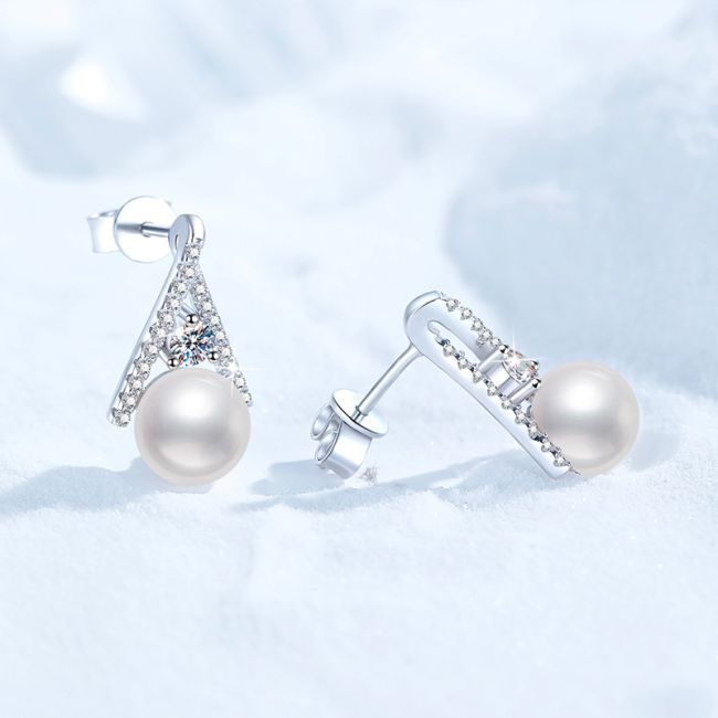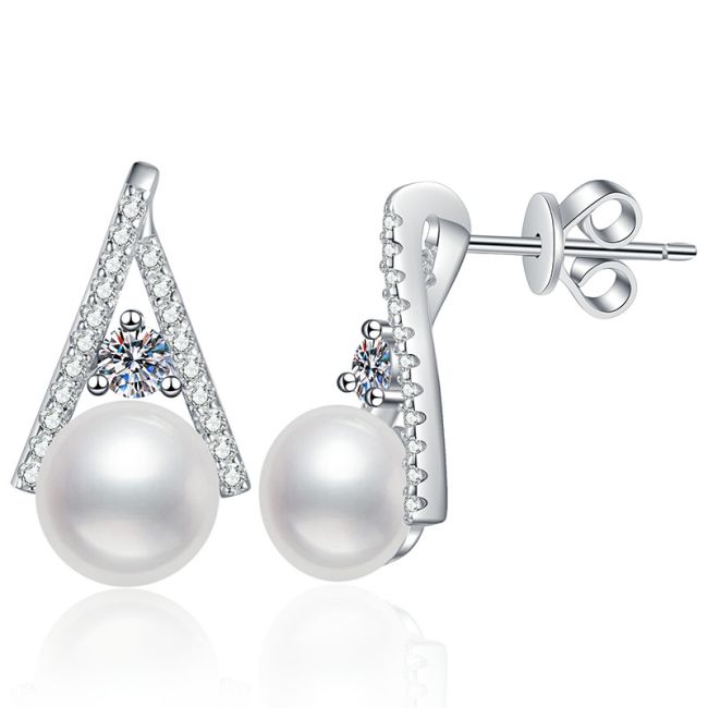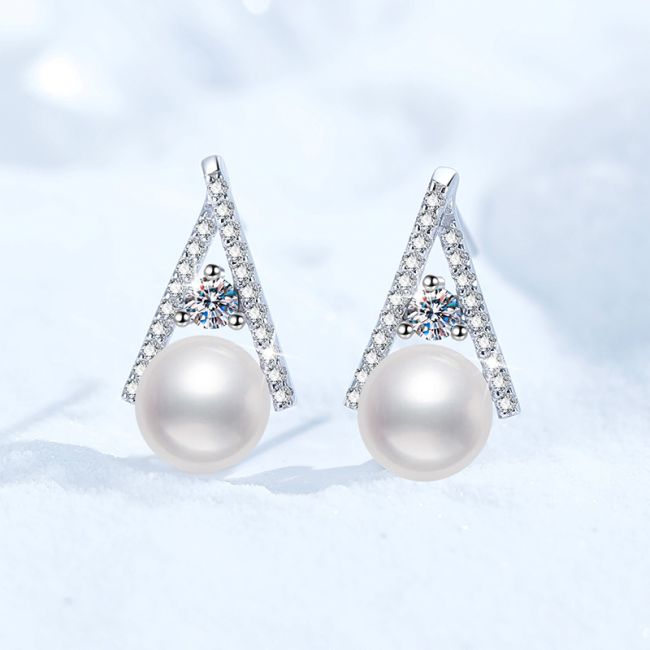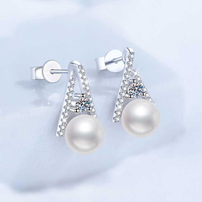 Earrings Sterling Silver Moissanite and Freshwater Pearl Triangle Drop Stud Earrings