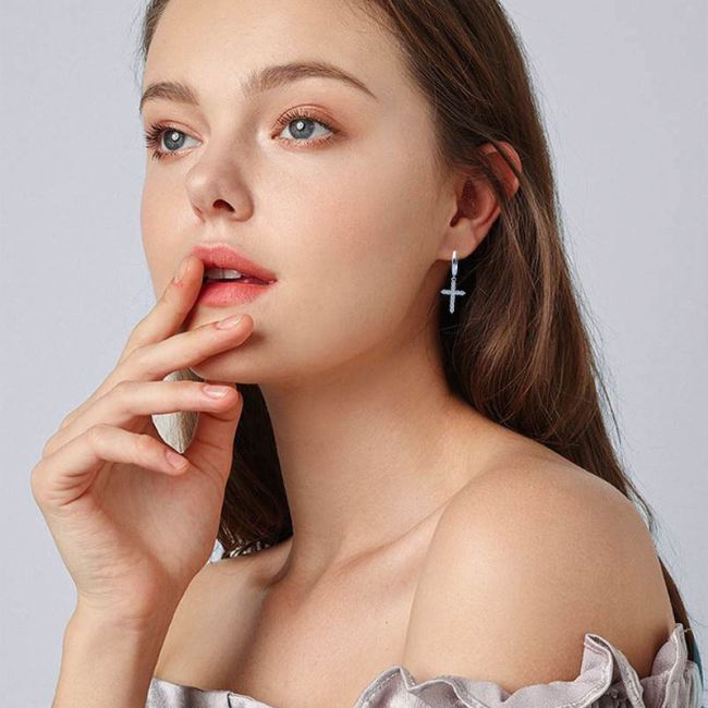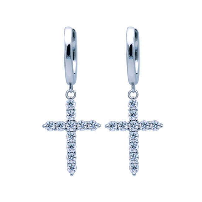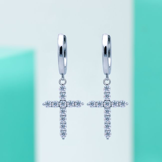 Earrings - Sterling Silver Moissanite Cross Stud Earrings with Pavé Setting