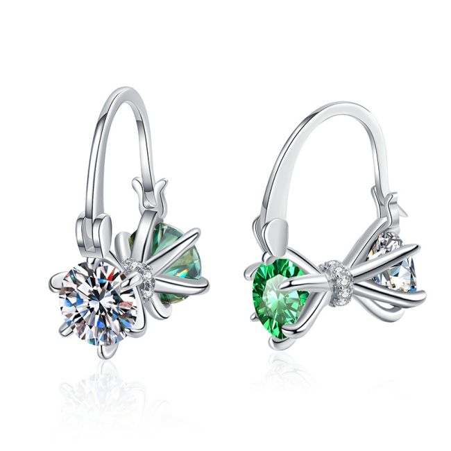 Earrings Sterling Silver Moissanite Drop Earrings with Emerald Green and Clear Stones Bow Design
