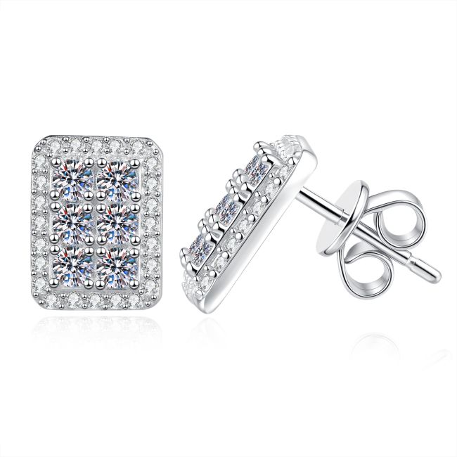 Earrings - Sterling Silver Moissanite Rectangular Stud Earrings with Full Pave Setting