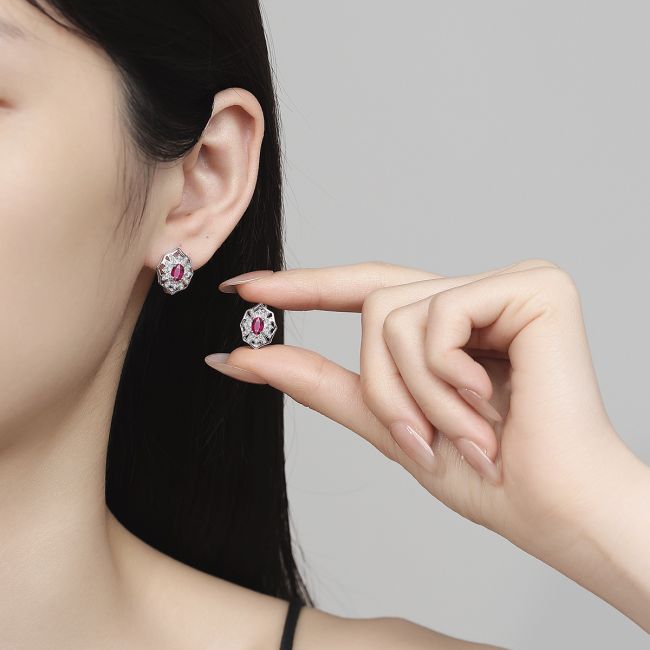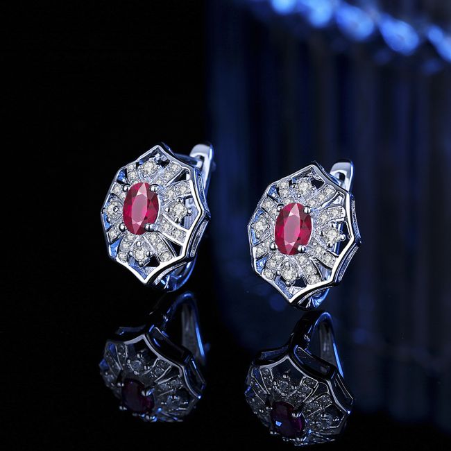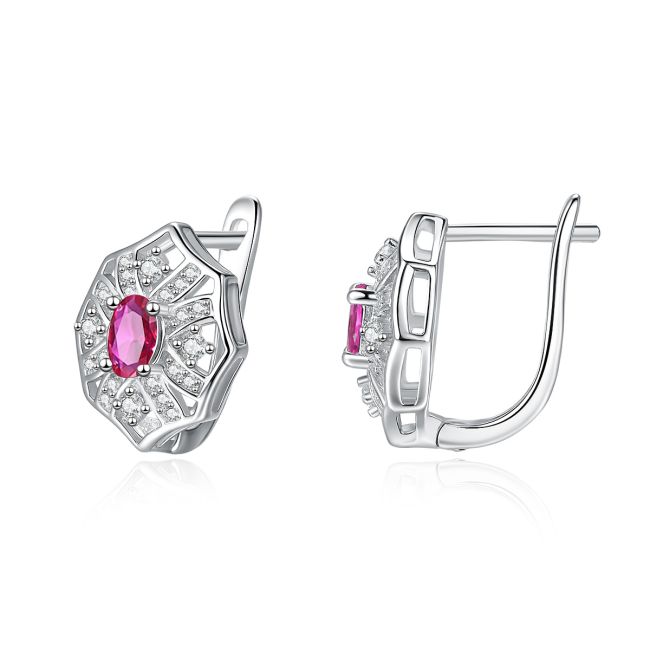Earrings - Sterling Silver Hoop Earrings with Pigeon Blood Red Cubic Zirconia Stones