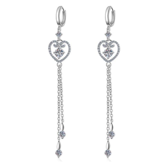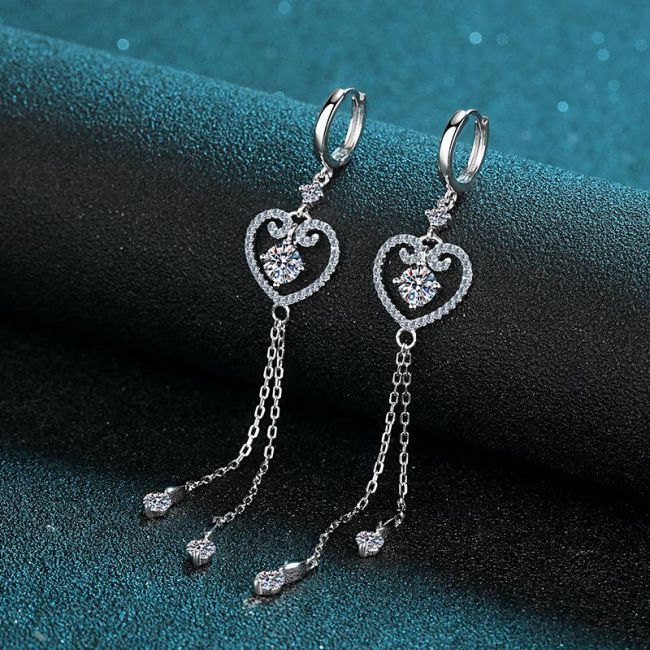 Earrings with Heart-Shaped Fringe and Bow Design Featuring 1 Carat Total Moissanite and 5mm Zircon Stones in Platinum-Plated S925 Silver