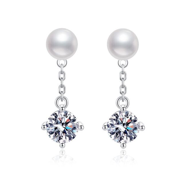 - Design: Classic drop earrings featuring pearl studs with dangling moissanite gemstones