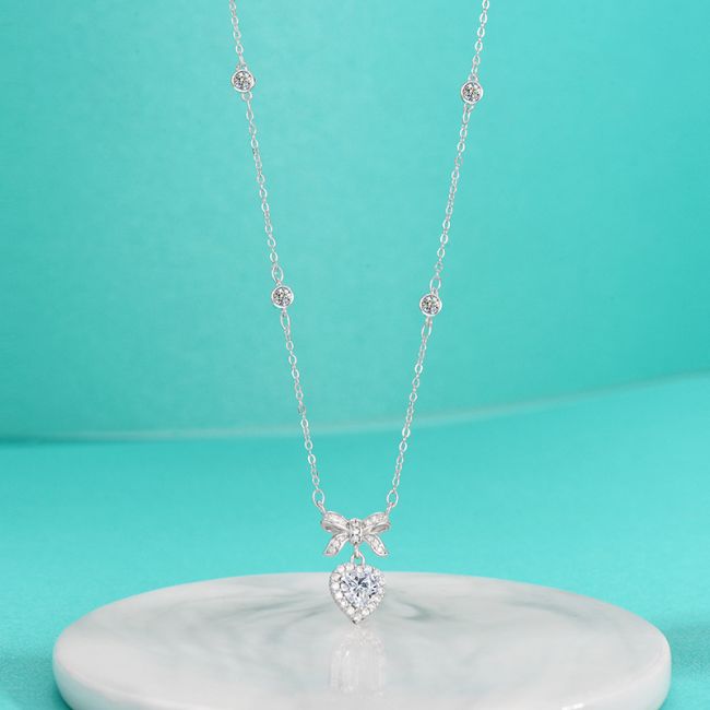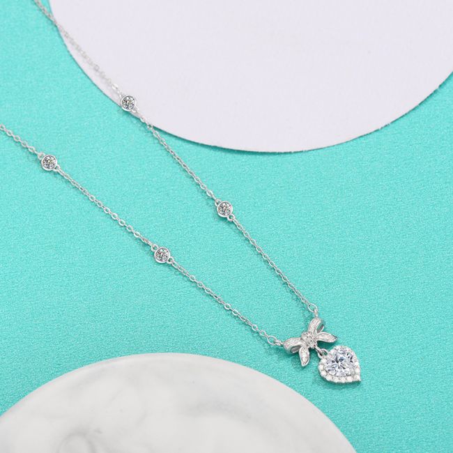 Necklace 925 Sterling Silver Moissanite Heart Bow Collarbone Chain Elegant Pendant