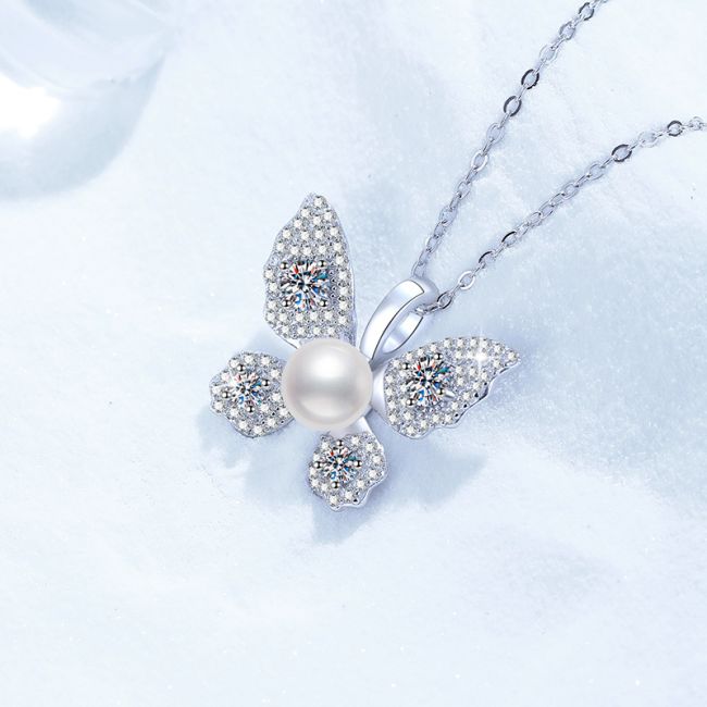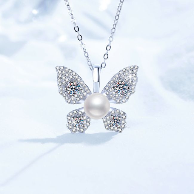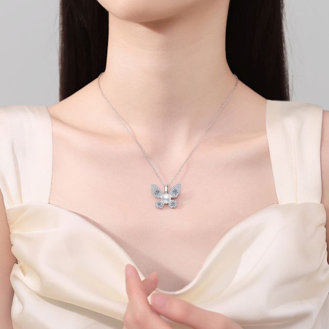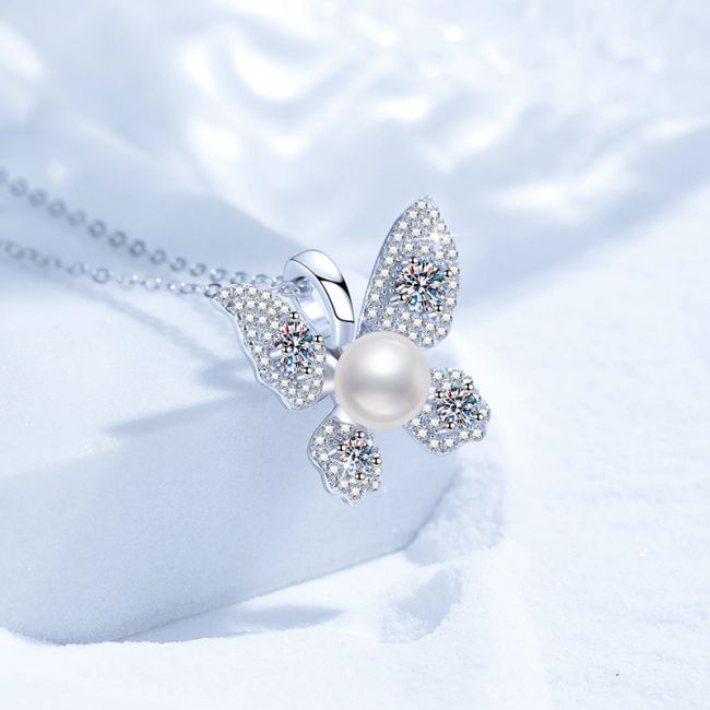 - Design: Elegant butterfly-shaped pendant with sparkling wings and pearl center
