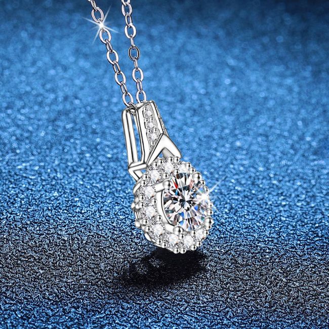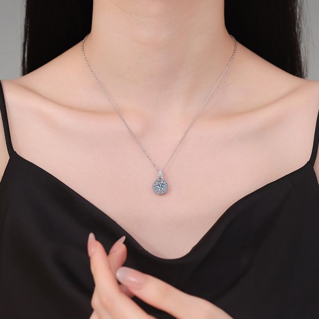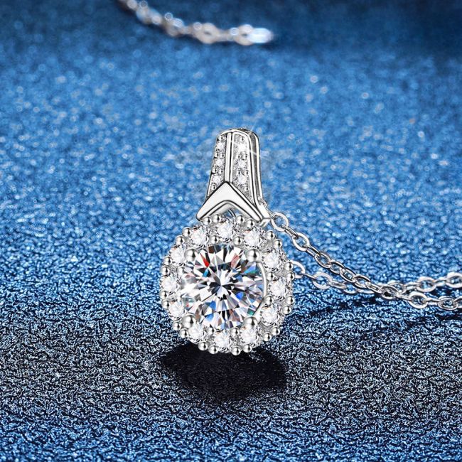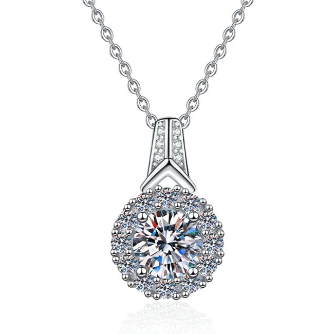 Necklace Sterling Silver Crown Halo Moissanite Pendant with Round Brilliant Cut Center Stone
