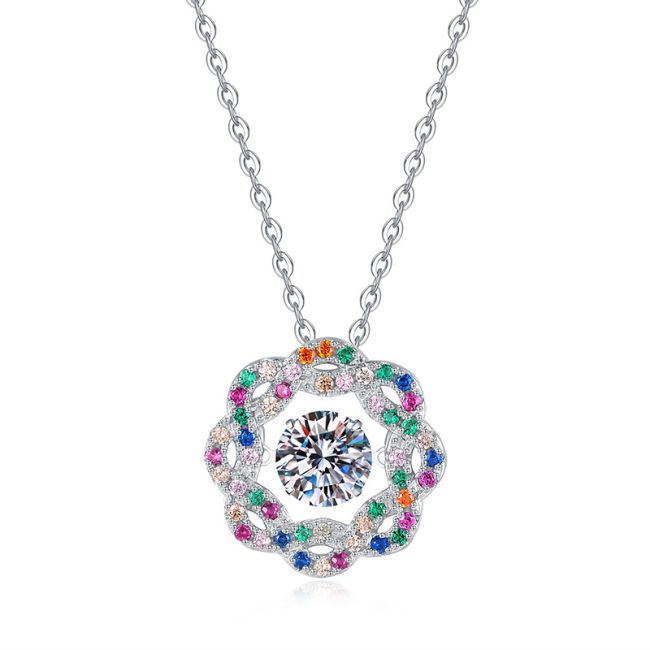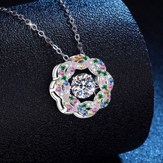 Necklace Sterling Silver Dancing Moissanite Pendant with Colorful Flower Halo Design