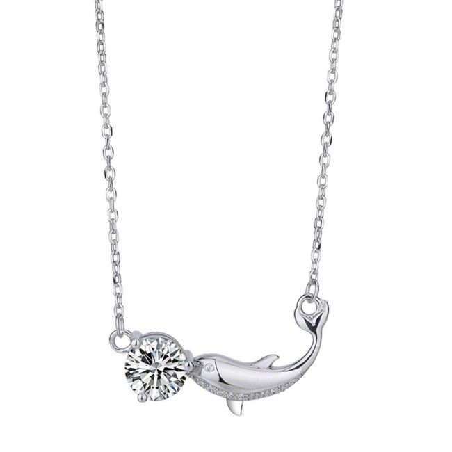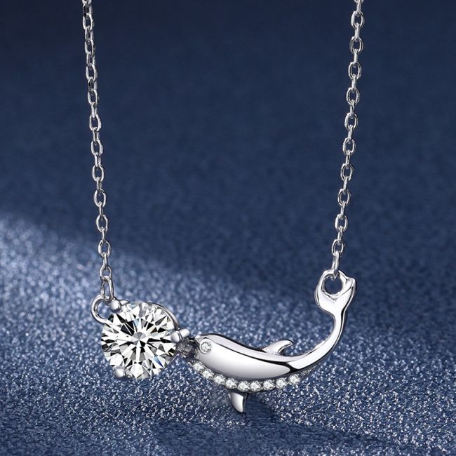 Necklace Sterling Silver Dolphin Pendant with Moissanite Stone Delicate Collarbone Chain