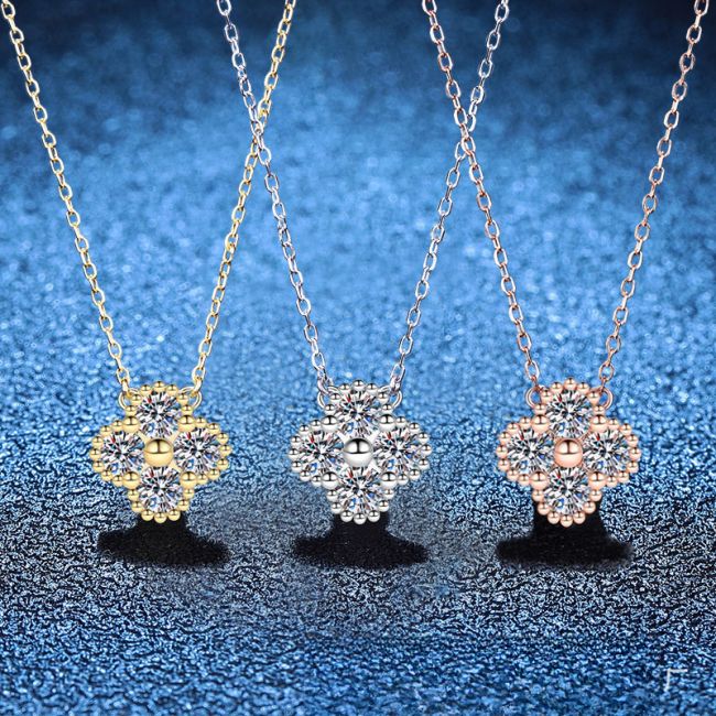 - Design: Four leaf clover pendant featuring a cluster of round-cut moissanite stones arranged in a lucky clover pattern