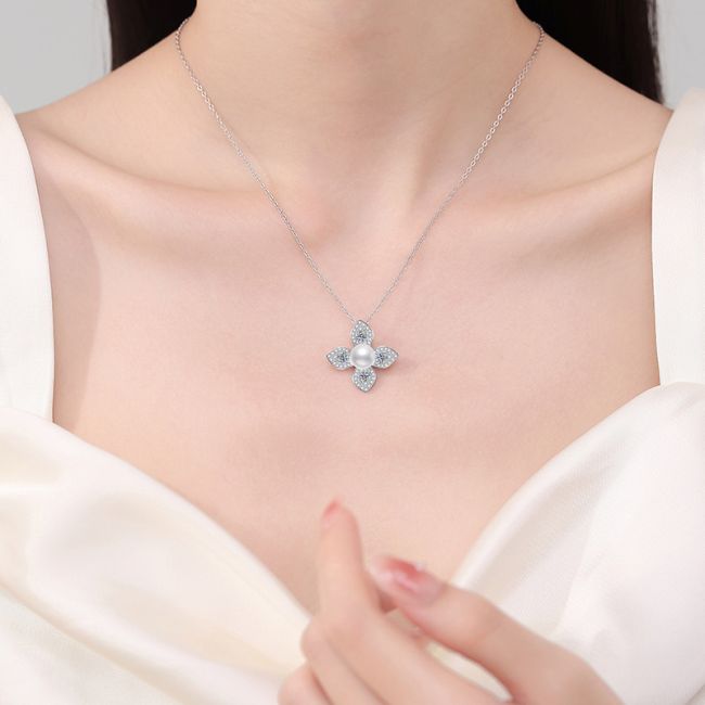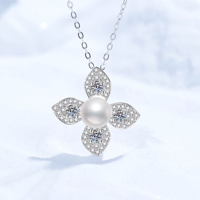 Necklace Sterling Silver Four Leaf Clover Pendant with Natural Freshwater Pearl and Moissanite Stones