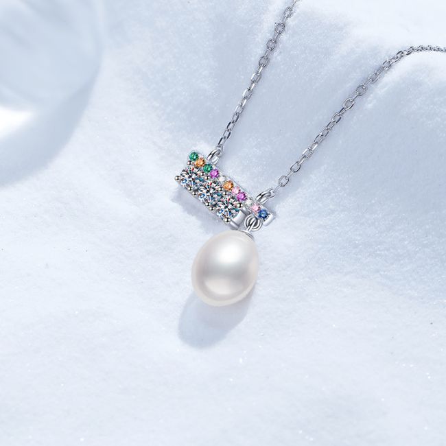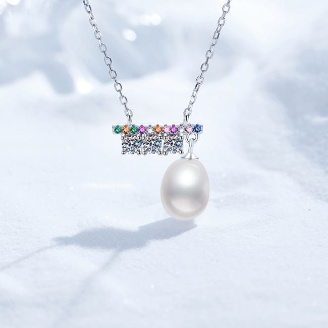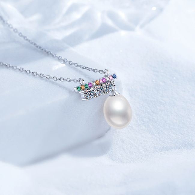 Necklace Sterling Silver Freshwater Pearl Pendant with Colorful Moissanite Bar Design