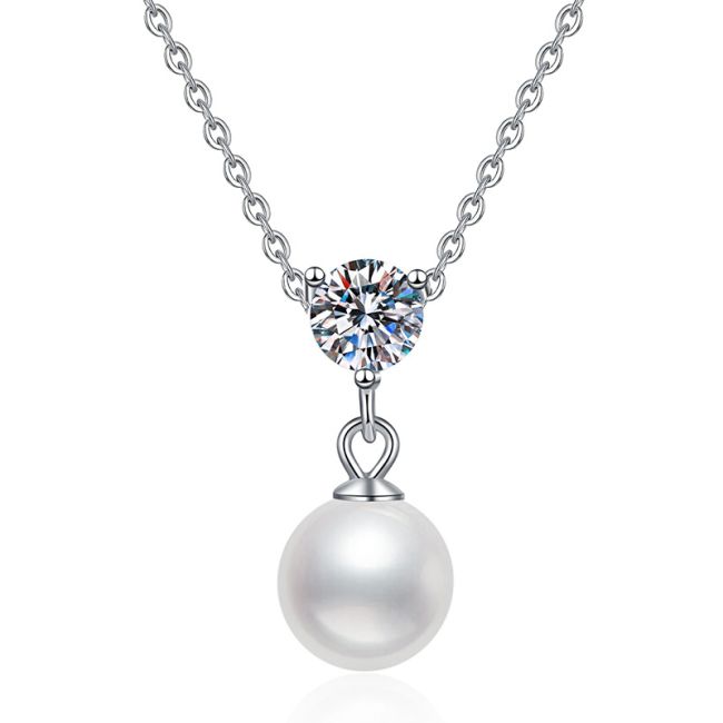 - Color Palette: Classic white pearl complemented by brilliant clear moissanite in polished silver setting