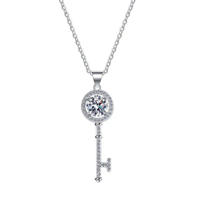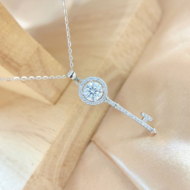 Necklace Sterling Silver Key Pendant with Moissanite Stone Delicate Collarbone Chain