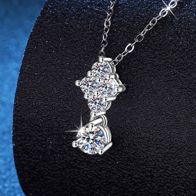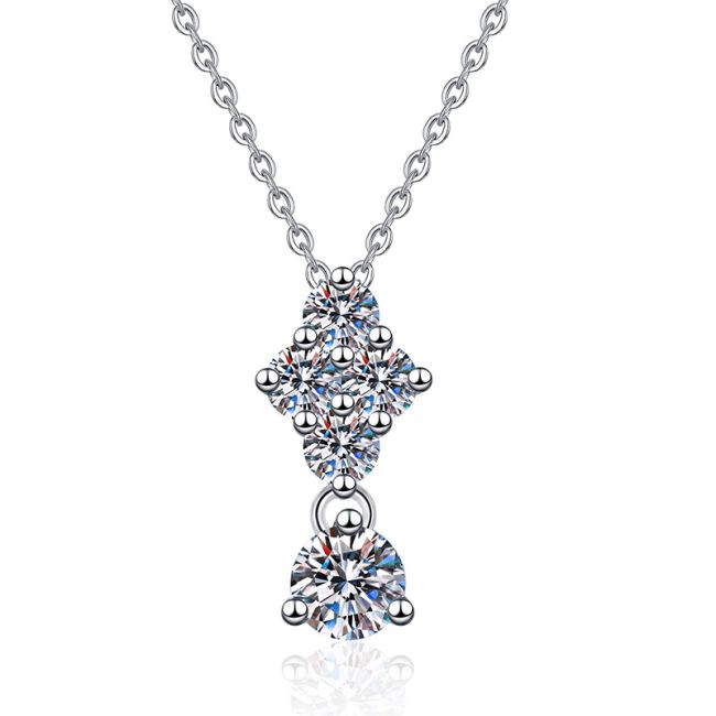 - Design: Elegant floral cluster pendant with four-stone arrangement connected to a single brilliant cut stone drop
