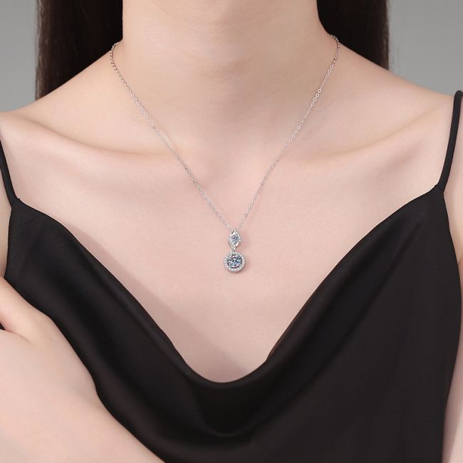 - Design: Elegant double-drop pendant featuring twisted decorative link connecting to halo-set round centerpiece