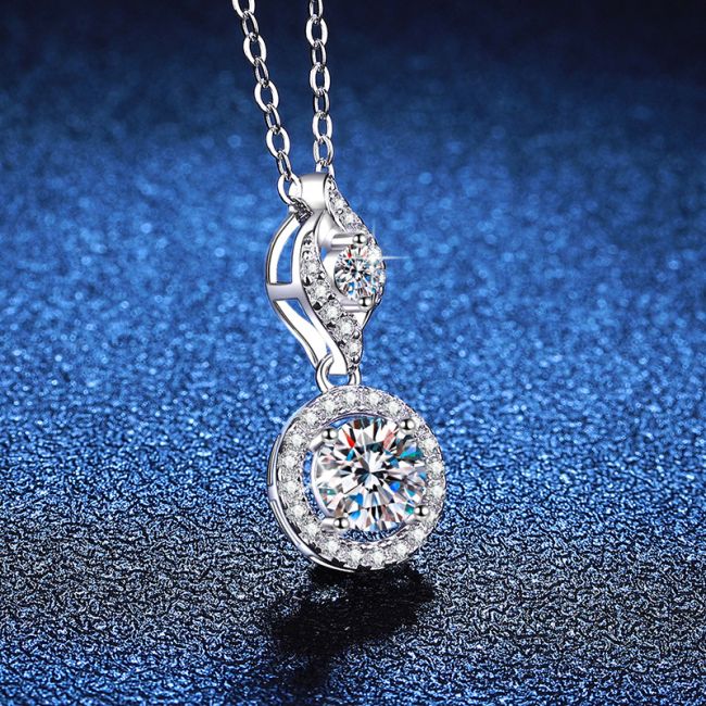 Necklace Sterling Silver Moissanite Pendant with Halo Design and Elegant Twisted Link
