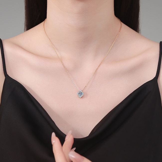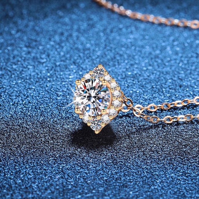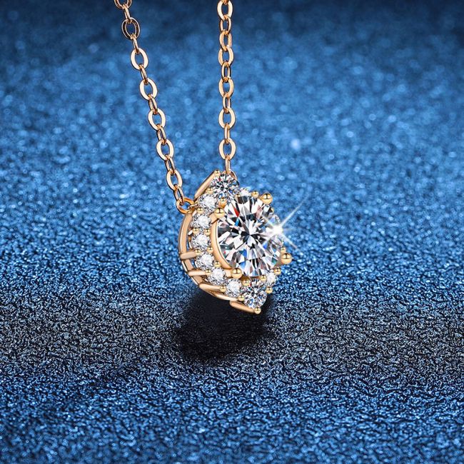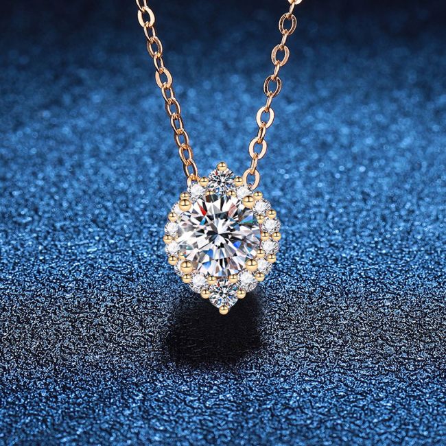 Necklace Sterling Silver Moissanite Pendant with Oval Halo Design and Champagne Gold Finish