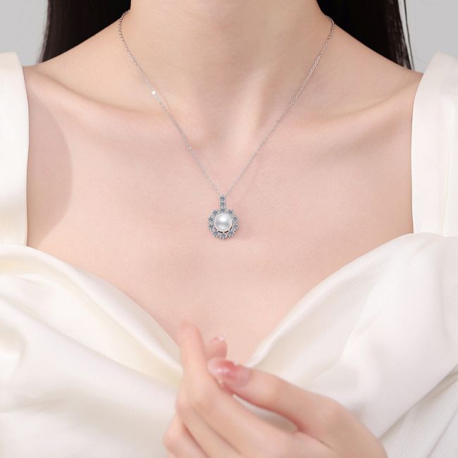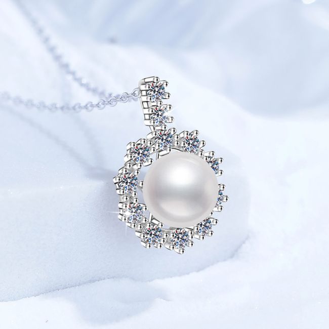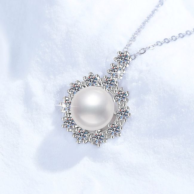 - Color: Radiant white pearl center with clear, diamond-like moissanite accents on polished silver