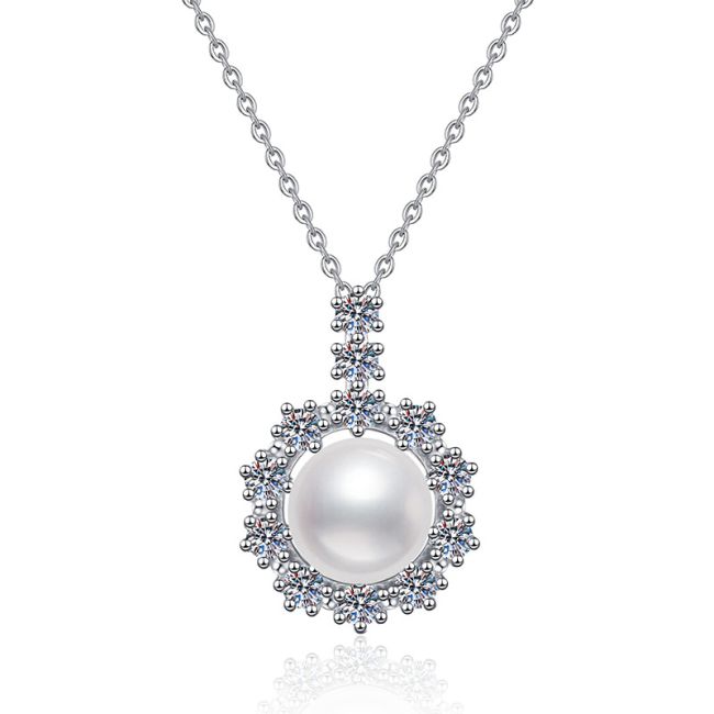 Necklace Sterling Silver Sunflower Halo Moissanite and Freshwater Pearl Pendant