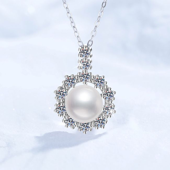 - Color: Radiant white pearl center with clear, diamond-like moissanite accents on polished silver
