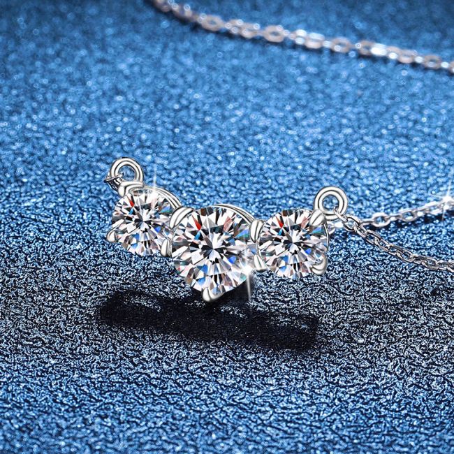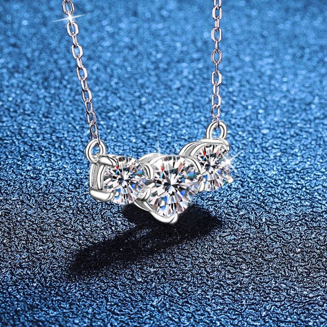 - Design: Three-stone pendant featuring graduated round brilliant cut moissanites arranged in an elegant smile curve