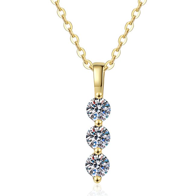 - Design: Elegant vertical three-stone drop pendant with graduated round moissanite arrangement