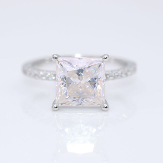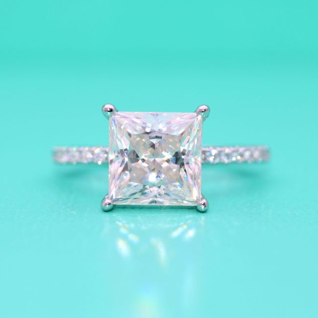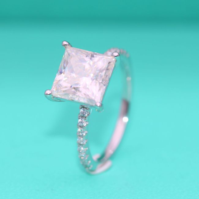 Ring - Square Princess Cut Moissanite Four Prong Setting Sterling Silver Stackable Band