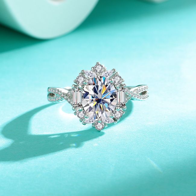 Ring Sterling Silver Oval Moissanite Engagement Wedding Band with Closed Setting