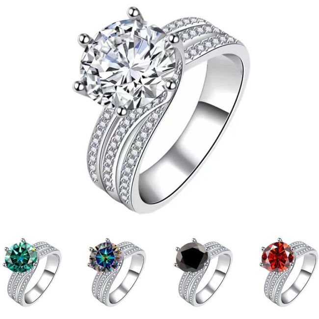 Ring Sterling Silver Six-Prong Moissanite Engagement Ring with White Gold Plating