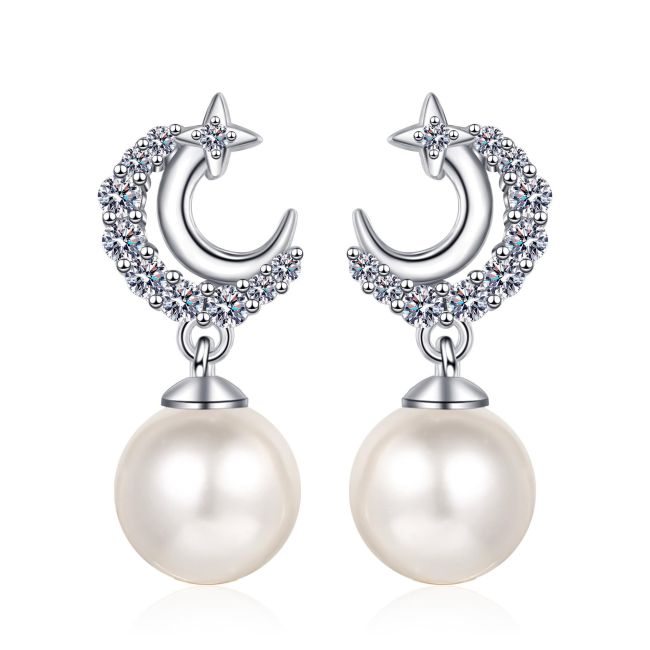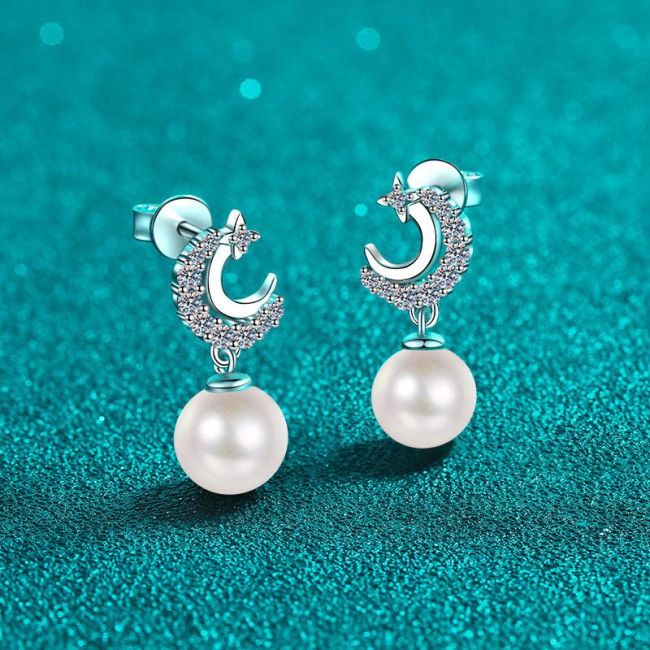 Star and Moon Pearl Earrings with 0.35 Carat Moissanite Accents in Sterling Silver