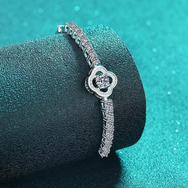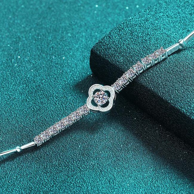 Sterling Silver Clover Moissanite Halo Tennis Bracelet with Floral Motifs